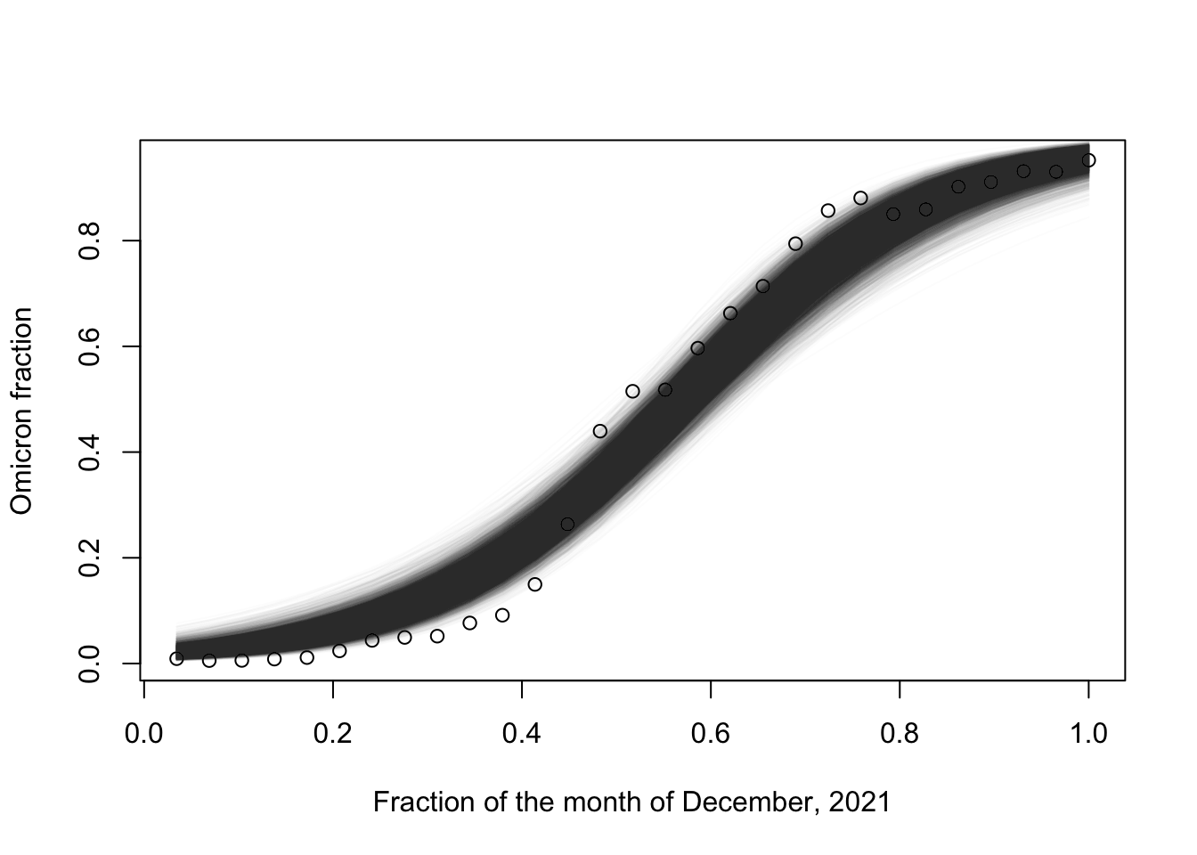 data = df$percentagexs =1:length(data) /length(data)plot(xs, data/100, xlab ="Fraction of the month of December, 2021", ylab ="Omicron fraction")for (i in1:n_samples) {lines(xs, samples[i,], col =rgb(red =0, green =0, blue =0, alpha =0.01))}